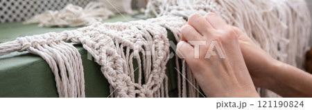 Woman's hand gently holds branch of lilacs. Spring blossoming