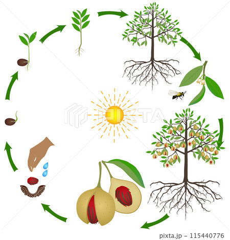 Life cycle of nutmeg plant on a white background.