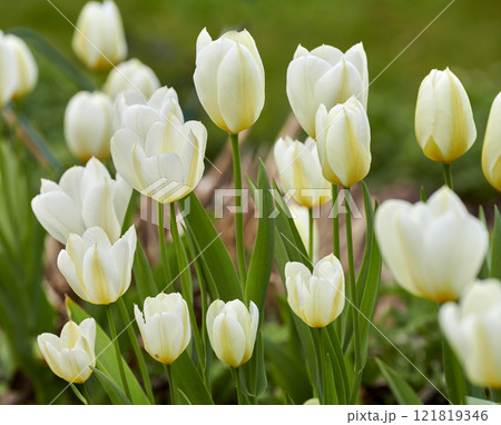 Closeup of beautiful white tulips blooming in a backyard garden in summer. Zoom of spring flowering plants opening up and blooming on a field in the countryside. Flowers in a natural environment