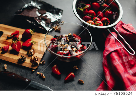 Cooking ingredients strawberry, chocolate, walnuts on the table