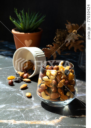 Mix of delicious assorted nuts and dried fruit in white cups on a table, sunny morning. Healthy gourmet vegetarian natural snack.