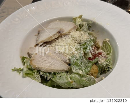 Caesar salad with roasted chicken, crispy croutons, shaved parmesan, pine nuts, and tomato slices plated on pristine white surface in dining establishment
