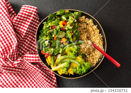 Fresh vegan avocado salad with grilled vegetables on dark plate