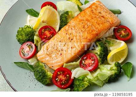grilled salmon fillet, with vegetables, broccoli, cherry, iceberg lettuce, spices and herbs, homemade, no people,
