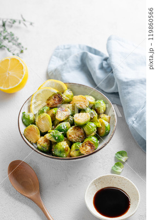 Fried brussels sprouts in a bowl with soy sauce, lemon and sesame on a light background with spoon