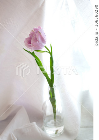 fresh beautiful peony purple tulip in a glass bottle on a white background. minimalistic design
