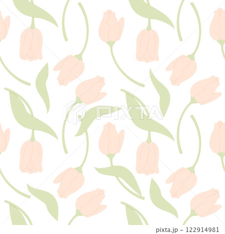 Seamless pattern pink tulips on white background. Botanical spring flower template in pastel colors. Vector illustration