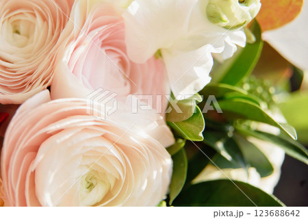Beautiful holiday card. Mother Day greeting card. Delicate bouquet of white ranunculus and pastel tulips with soft green leaves, creating a romantic and elegant floral scene