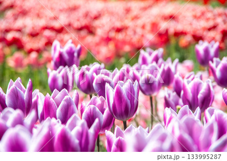 Blooming tulips flowerbed in Keukenhof flower garden, also known as the Garden of Europe. One of the world's largest flower gardens. Lisse, the Netherlands.