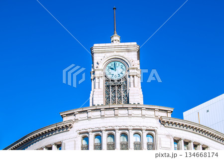 日本の東京都市景観新時代へ。カウントダウン。青空に映える時計台。…10時まであと少し…=23日