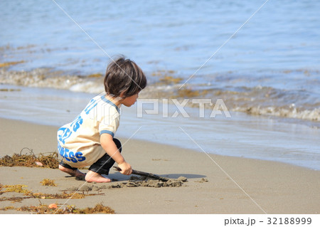砂浜で遊ぶ2才児