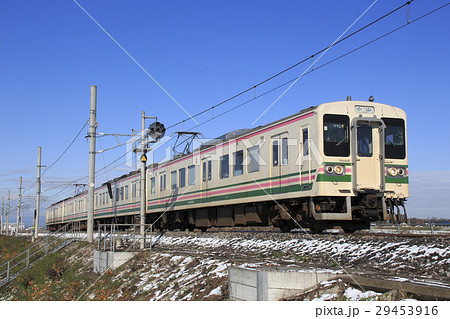 群馬県庁、雪の上越線107系電車