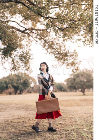 秋冬の公園を散策する若い女性