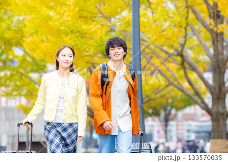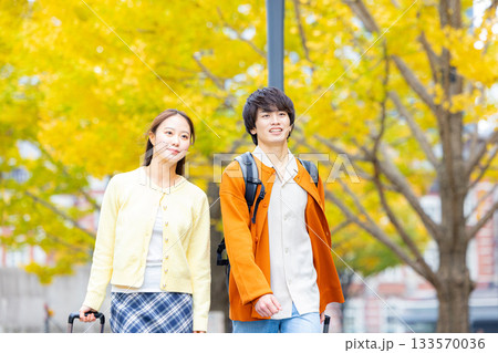 東京に旅行に来たカップル 秋
