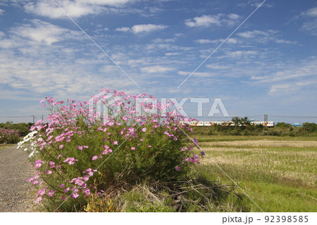 田んぼの一角に咲くコスモスと信越本線115系電車
