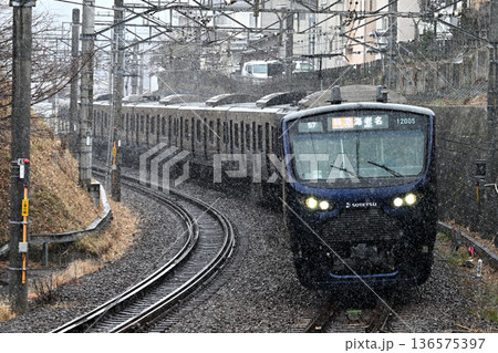 雪の舞う中を走る相鉄12000系電車