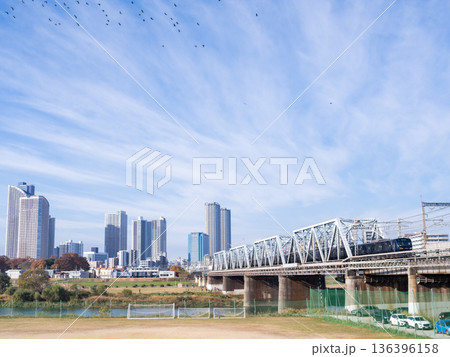 日本の東京都市景観 渋谷駅前を走る電車。奥に宮下公園