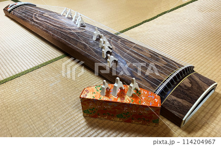 日本の和室の畳の上に伝統的な13本の弦楽器である琴柱付きの箏がある。
