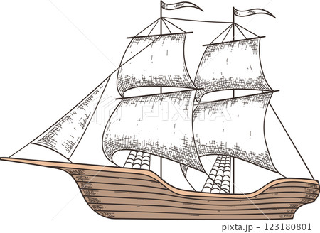 Hand drawn illustration depicting a caravel, a small, maneuverable sailing ship used by the Portuguese and Spanish for exploration and trade during the 15th to 17th centuries