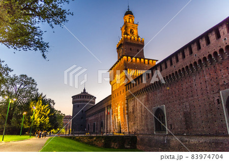 Old medieval Sforza Castle Castello Sforzesco lightning facade, walls, tower La torre del Filarete