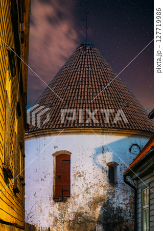 Parnu, Estonia. Night Evening View Of Red Tower Is The Only Surviving Part Of City Defensive Wall, Was Used As Prison