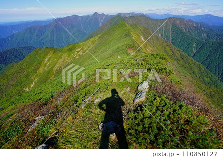 ペテガリ岳山頂からの日高山脈北部を眺める登山者の影