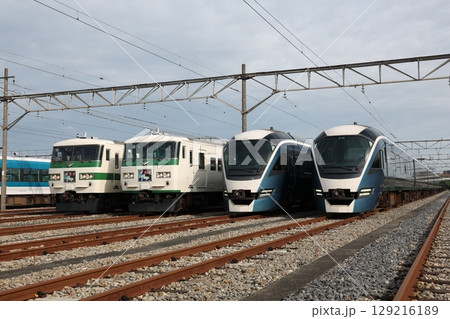 車両基地に停車する185系電車(新幹線リレー号表示)