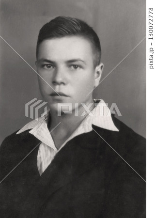 An old photo of a young man of about eighteen. Photo from 1954. USSR, Ukrainian SSR, Kharkov.