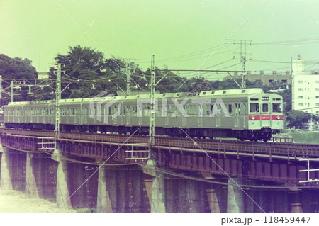 東横線多摩川旧橋梁を走る7000系急行・7028他8両、1976年7月30日