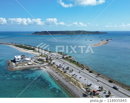 沖縄県うるま市の4つの島を結ぶ海中道路の空撮