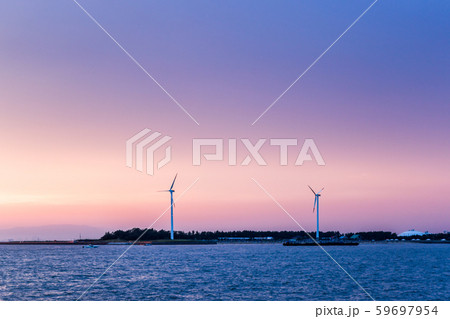 快晴の海辺の風車発電