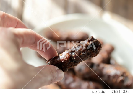 しっかり太めの2度がけ黒糖かりんとうを持つ指