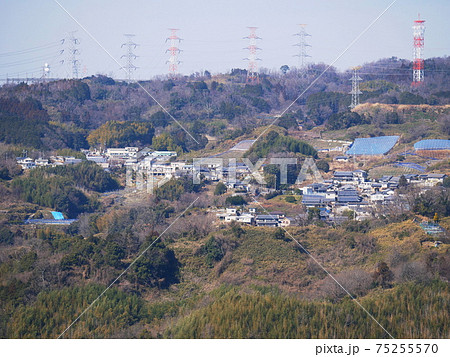 奈良県 王寺町 明神山から望む高安山の送電線と竜田古道 (生駒山地、立春)
