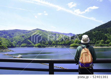 5月に東京都奥多摩町の奥多摩湖(小河内貯水池)を観光する男性