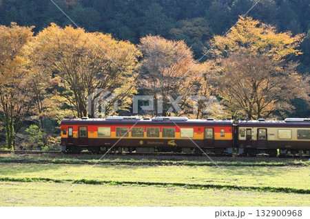 わたらせ渓谷鐵道「色鮮やかな列車と木々の紅葉背景に」