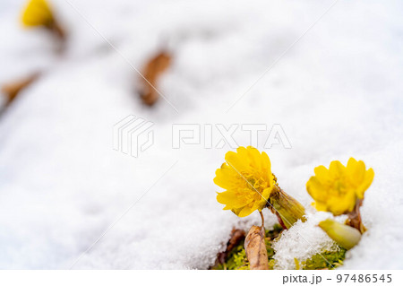 積雪に負けずに咲く黄色い花 花2月フクジュソウ福寿草76V9.16