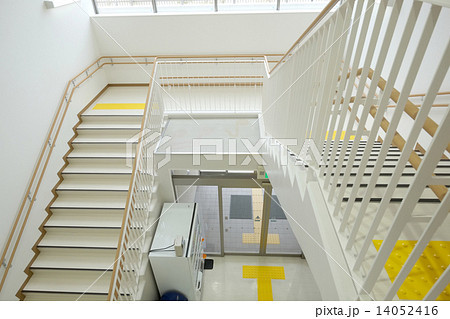 Yellow diagonal stairway with dark brown railings on beige building with windows