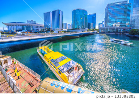 日本の東京都市景観 隅田川と水上バス「エメラルダス」、「ホタルナ」。奥に特急