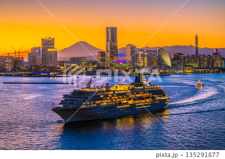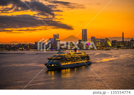 日本の横浜都市景観飛鳥Ⅱや富士山、横浜みなとみらいなどを望む