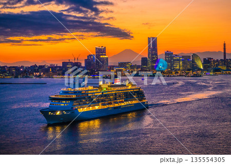 日本の横浜都市景観飛鳥Ⅲと富士山、みなとみらいが競演…希望の光…日本の豪華客船時代の幕開け