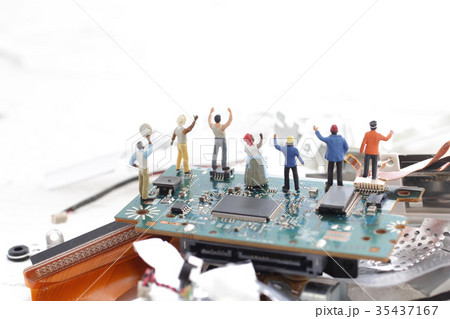パソコンの残骸と人間のミニチュア人形