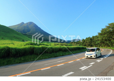 夏の湯布院 狭霧台付近のドライブイメージ (由布岳と白いミニバン)