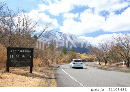 冬の湯布院塚原高原のドライブイメージ (由布岳と白い普通車)