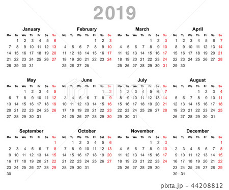 2019 year annual calendar (Monday first, English)