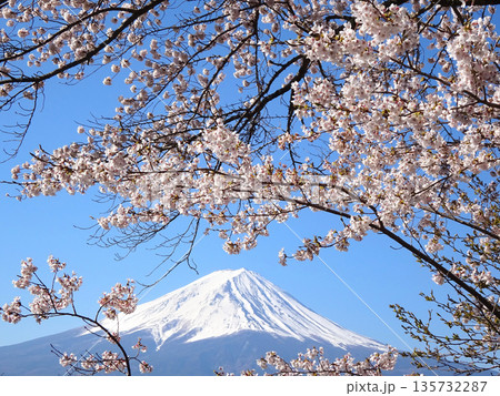 春の晴天の日に満開桜の隙間から見える富士山