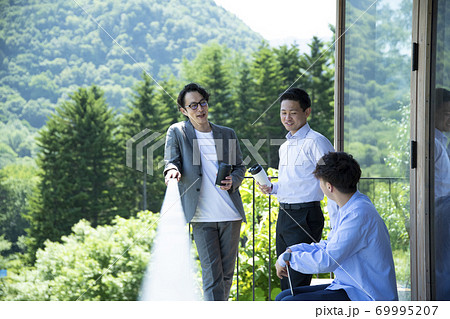 バルコニーで談笑するビジネスマン