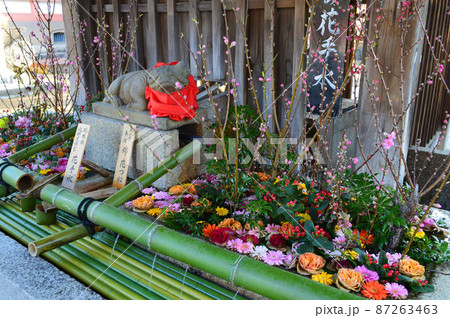 梅の名所京都市北野天満宮の花手水が美しい