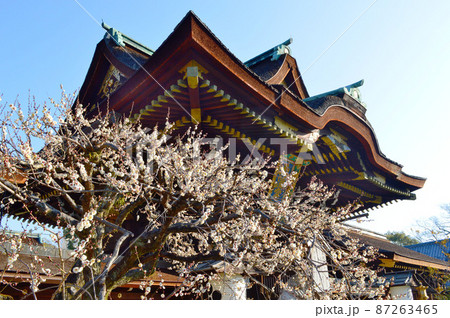 京都市北野天満宮の絢爛豪華な三光門前の白梅が美しい
