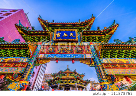 日本の横浜都市景観 2月。横浜中華街・横濱媽祖廟や上空の飛行機などを望む…新時代へ=8日
