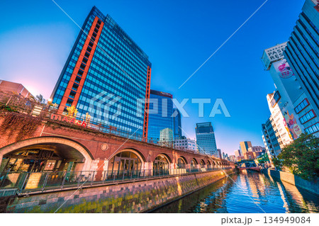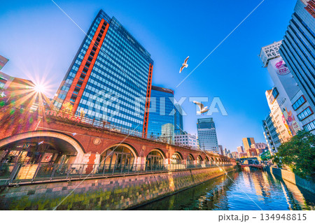 日本の東京都市景観希望の光…万世橋からマーチエキュート神田万世橋や神田川、御茶ノ水駅方向などを望む